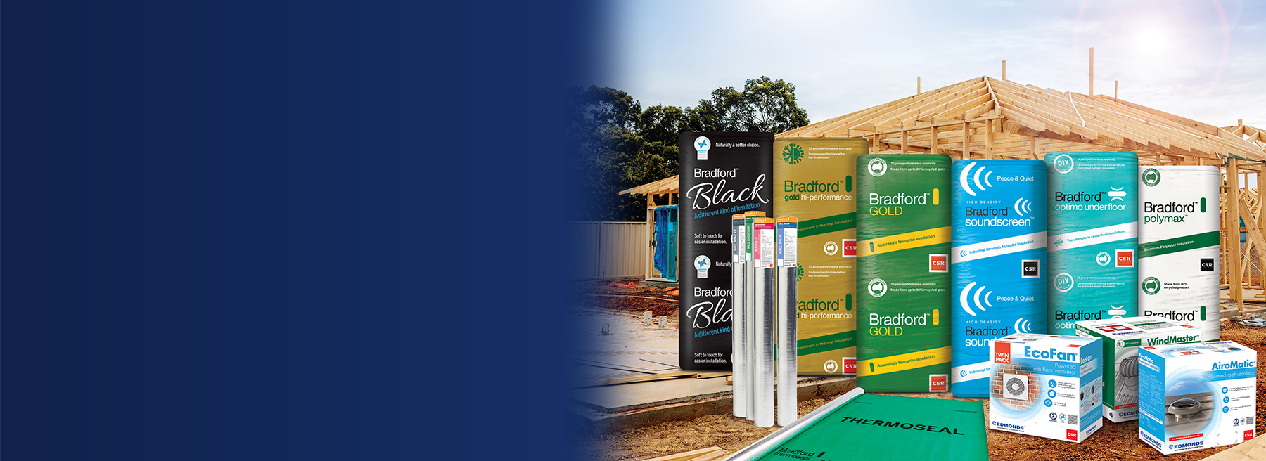As a Bradford Authorised Distributor, we sell a wide range of insulation products including Bradford Glasswool Insulation, Soundscreen, Optimo, Acoustigard, Anticon, Proctorwrap, Edmunds Vents, Rockwool Fibretex, Fireseal, Foilboard, Kingspan, PIRMax, Foamex, Polyester Insulation including Polymax by Bradford, Slab Insulation, vapour permeable membrane wrap as well as foil wrap and the various accessories required to install them.